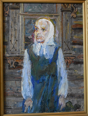 «Прямой потомок Ивана Сусанина здесь жила, в этой комнате - Марья Геннадьевна Соболева. Она мне все рассказывала про Сусанина. Я не просто надумал его образ, он, в том числе, и благодаря рассказам Марьи Геннадьевны родился. Высокого роста, здоровая такая была, крепкая, хотя, когда мы с ней познакомились, ей уже лет восемьдесят было. Работала на комбинате им. Ленина во время Великой Отечественной, шила фуфайки для фронта. Ее муж погиб на войне. Родственников близких не было, детей не было. «Я последний потомок Сусанина, - говорила она мне, - будут другие утверждать, что они потомки, не верьте, никого уже нет»… Да вот у меня и портрет ее есть, в этой комнате его писал».